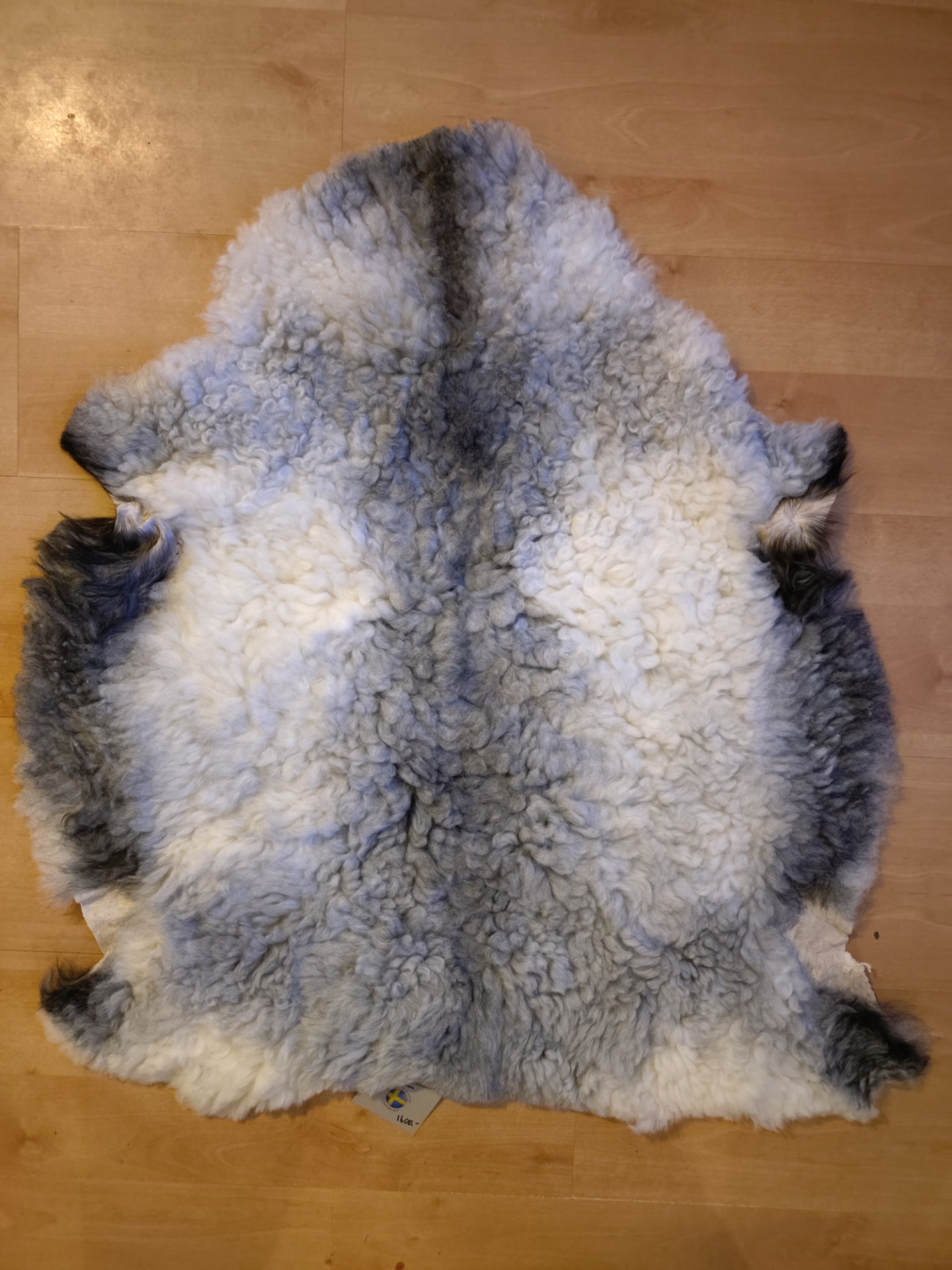 Nr 6. Gråmelerat skinn med vit botten. Mörkare i kanterna på långsidan. Klippt till ca 35 mm längd på ullen. Storlek 76x83 cm.