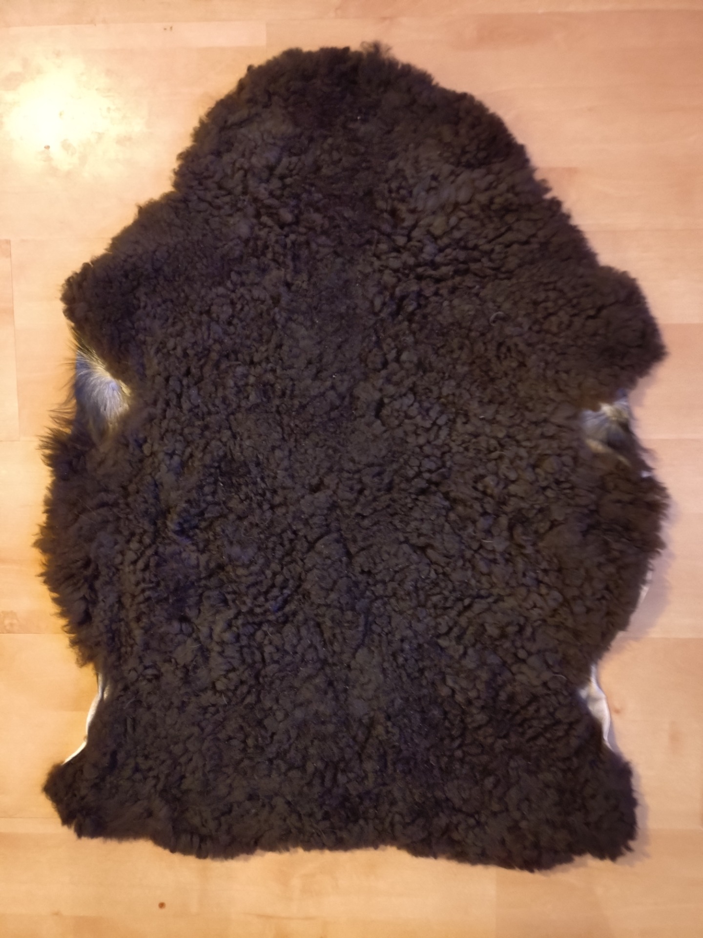 Nr 16. Helsvart skinn med brun ton och små lockar. Klippt till ca 35 mm längd på ullen. Storlek 66x81 cm.
