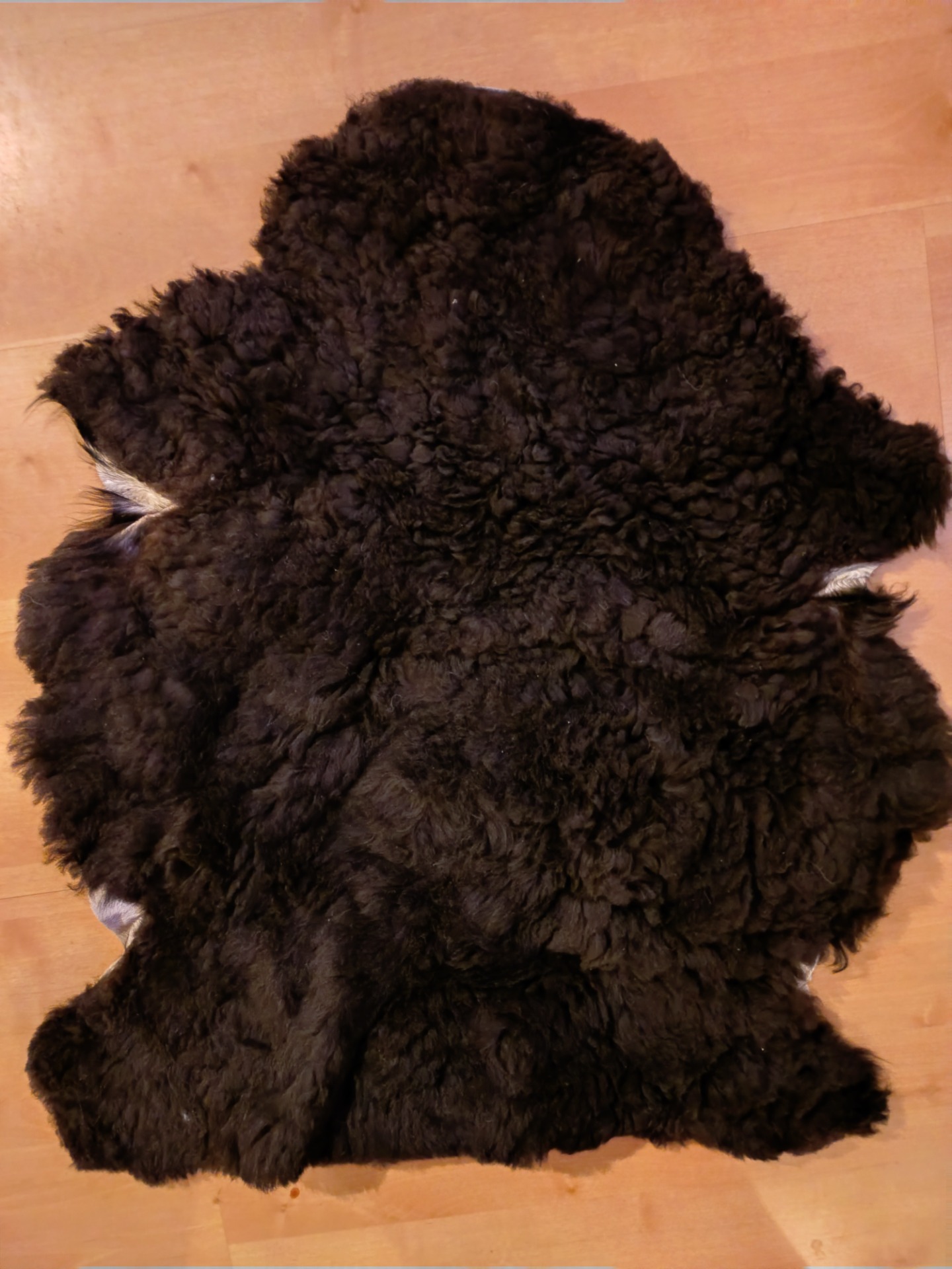 Nr 17. Helsvart skinn med lätt brun ton på vissa delar. Varierade lockar, från små till ganska raka. Klippt till ca 35 mm längd på ullen. Storlek 74x83 cm.