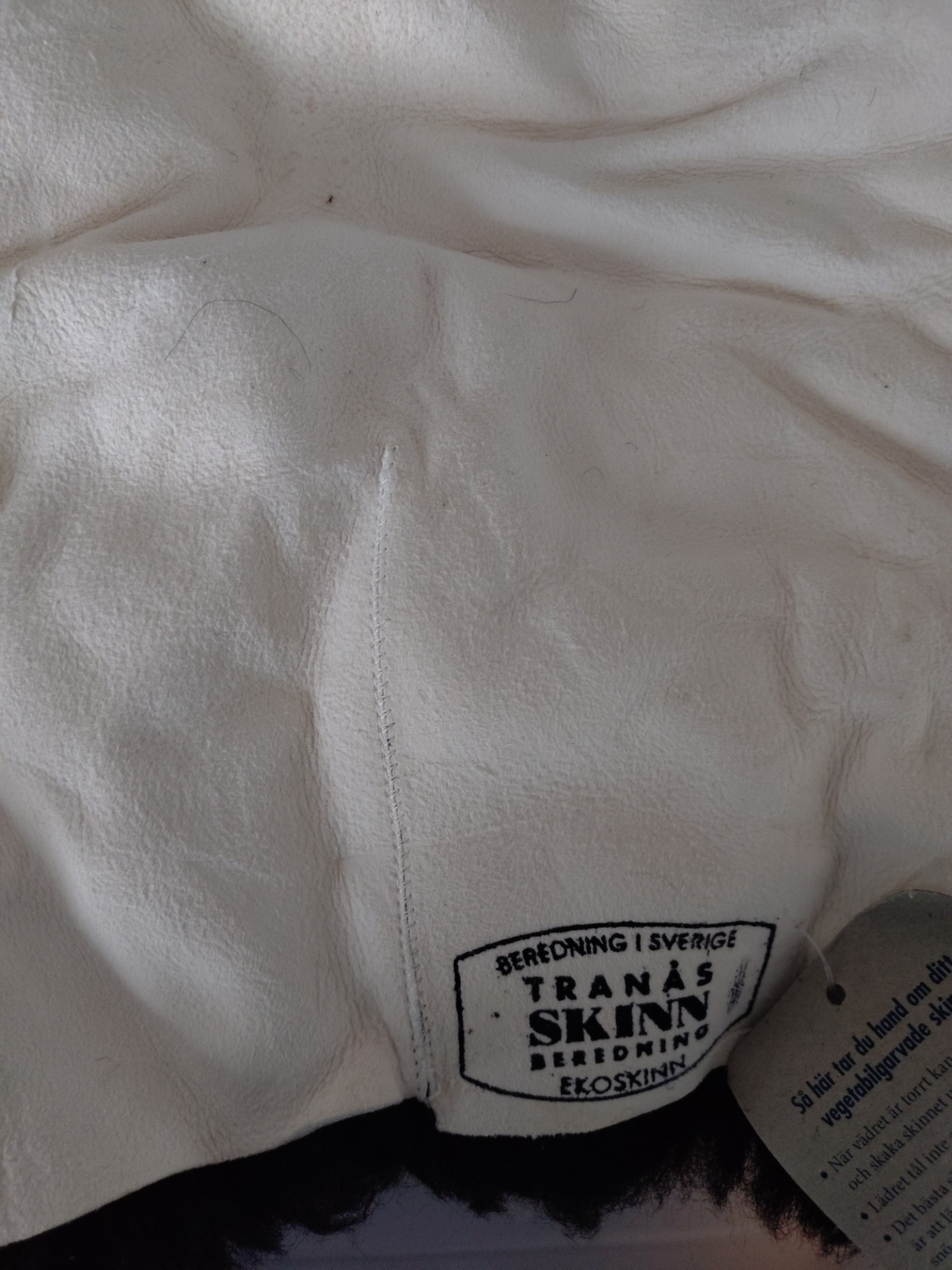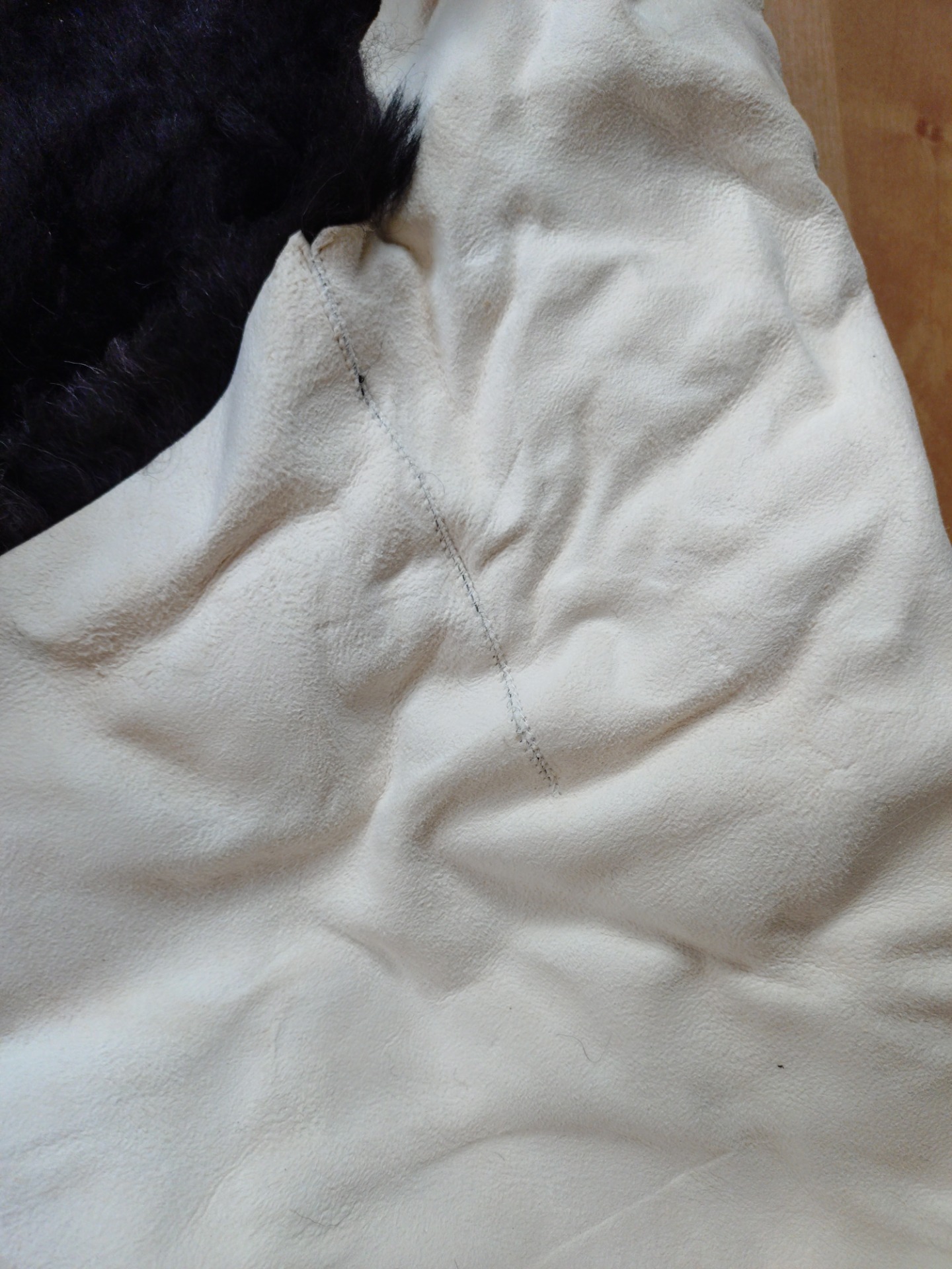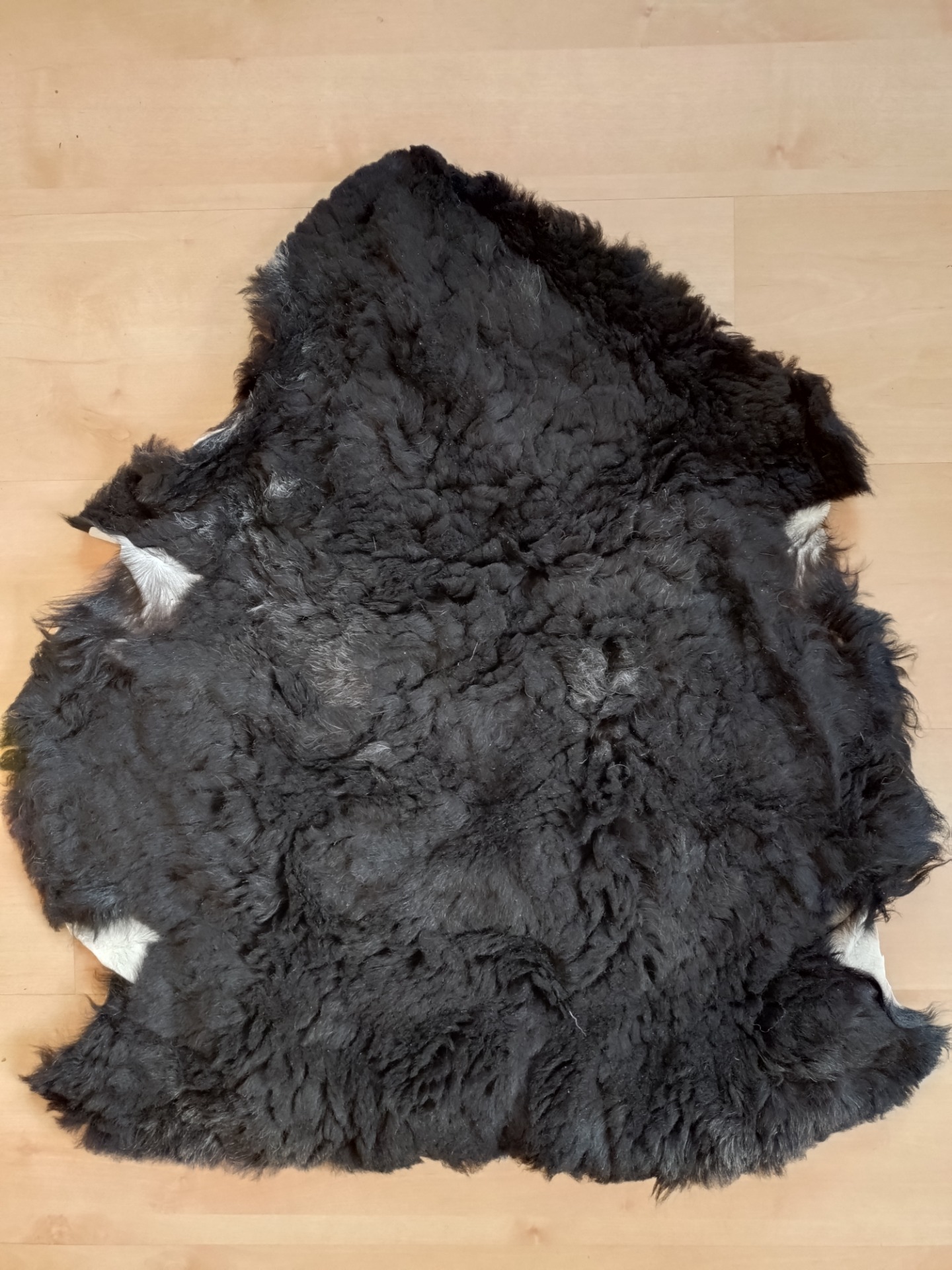 Nr 14. Svart skinn utan lockar. Har en del grått insprängt i det svarta på några partier. Finns två lagningar på baksidan, ca 10 cm långa sömmar. Klippt till ca 35 mm längd på ullen. Storlek 77x84 cm.